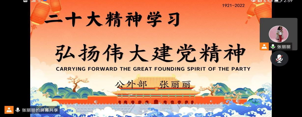 为进一步引领部门教师深入学习党的二十大精神,2022年12月1日,公共外语教研部党支部书记张丽丽通过腾讯会议作关于“弘扬伟大建党精神”的专题宣讲,全体党员参加会议。