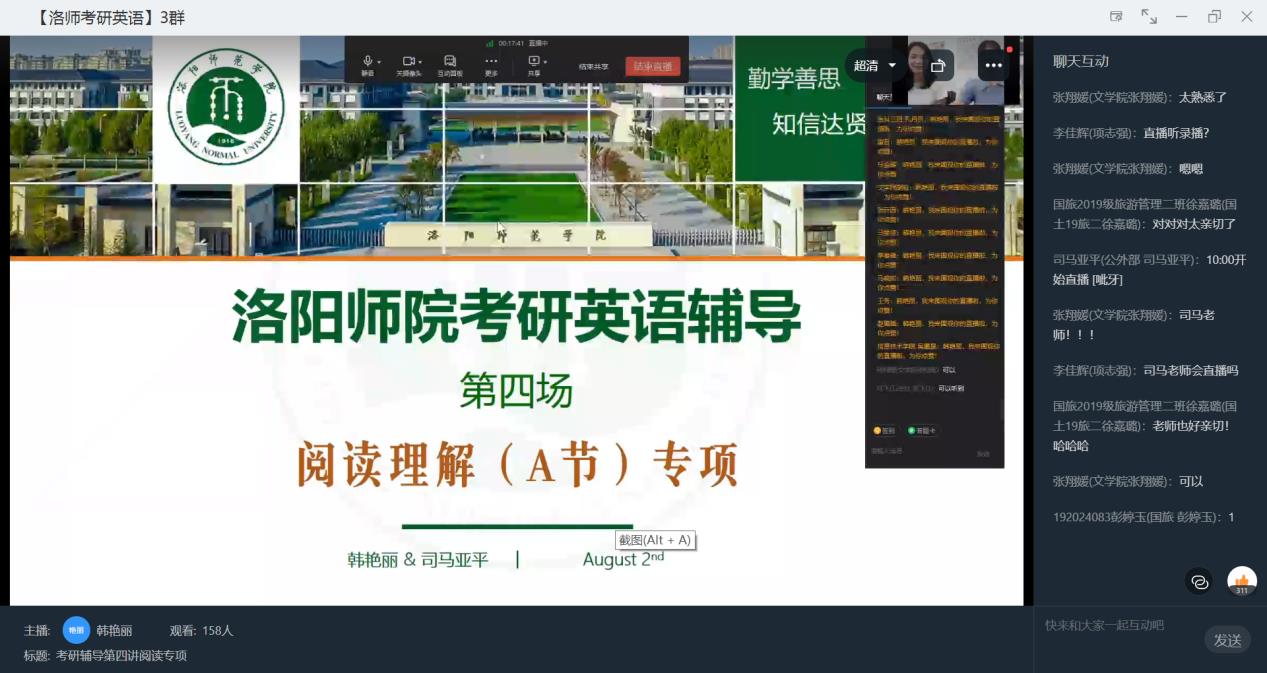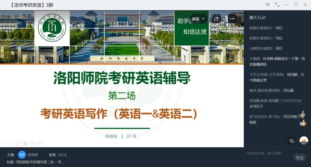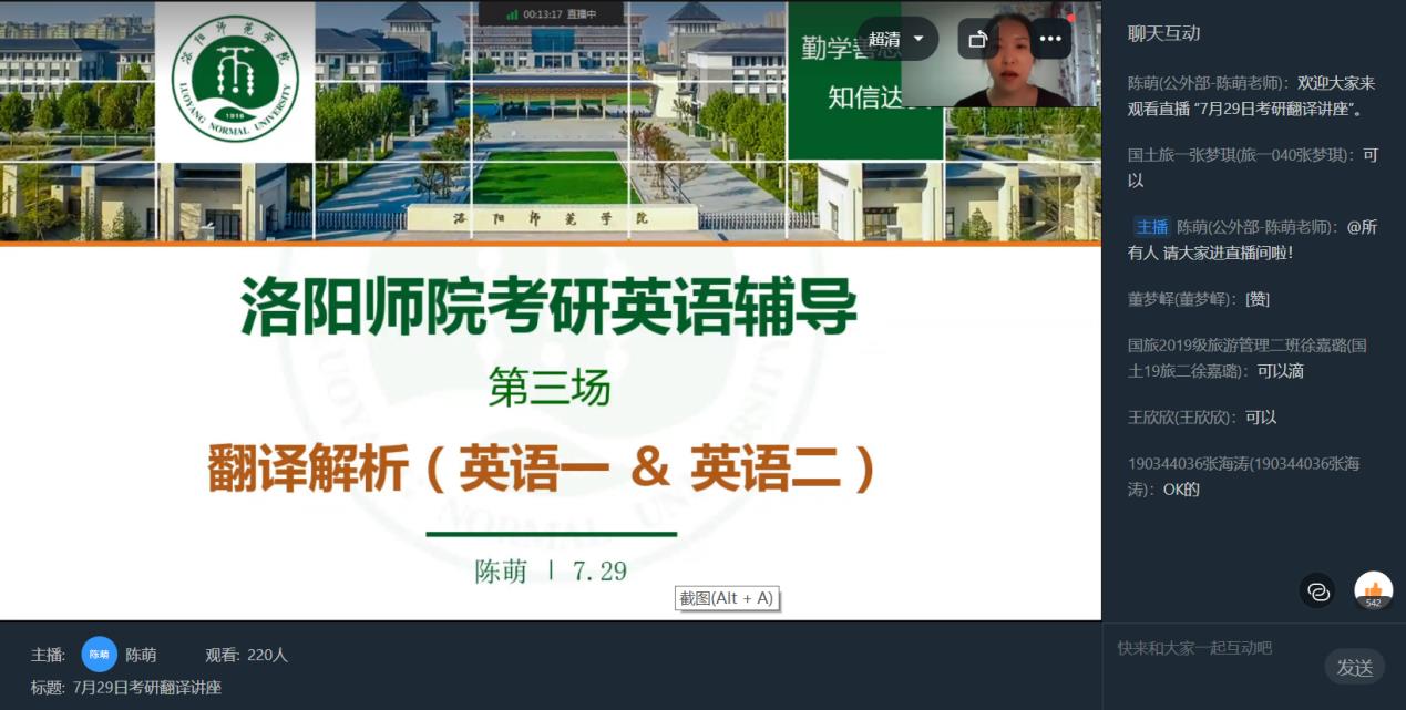 为帮助全校考研学生更好地制定英语学习计划和复习策略,公共外语教研部在教务处的组织带领下,于7月15日至8月2日期间开设四次考研英语专题讲座,为洛师学子考研保驾护航,得到全校师生的热烈反响。