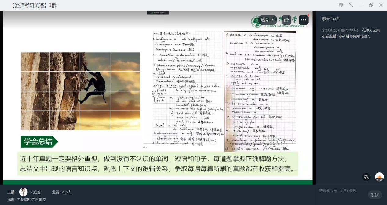 此次系列讲座由公外部王芳、任玲玲、陈萌、宁旭芳、韩艳丽、司马亚平六位教师主讲。系列讲座紧密围绕研究生英语考试大纲,结合近十年真题考点,帮助学生们梳理考研英语复习的重难点、做题方法和思路,引导学生科学高效地备考。讲座时间安排如下:7月15日上午由王芳老师主讲“考研英语导学+阅读新题型梳理”,7月18日上午由任玲玲老师主讲“考研英语写作”,7月29日上午由陈萌、宁旭芳老师共同主讲“考研翻译解析与完形填空”,8月2日上午由韩艳丽、司马亚平老师共同主讲“考研英语阅读理解”。各位老师大量查阅相关资料,精心准备讲座课件,通过解读考试大纲,分析历年真题考题特点,为学生们提供科学的备考建议和复习方法。此外,各位主讲老师还为学生们筛选了优质备考资源,上传至钉钉群供学生们下载查看。