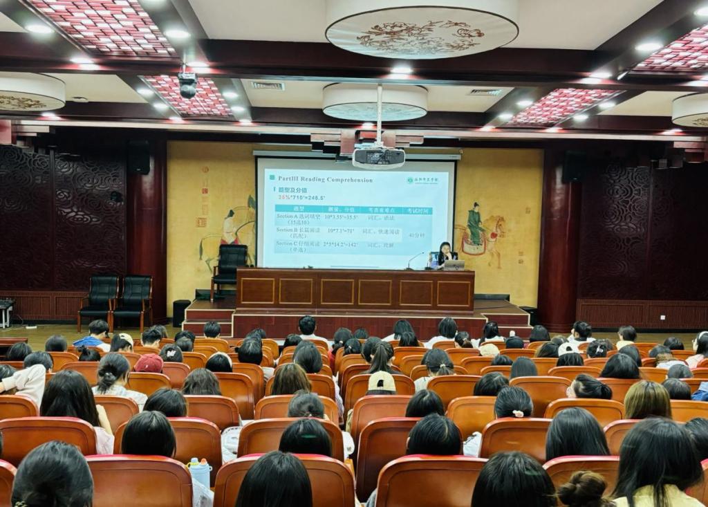 讲座伊始,王芳老师总体介绍了四级考试的基本情况,包括笔试试题结构及分值、口试题型及评分标准等,她强调了四级对于学生将来就业和考研的重要性,鼓励同学们努力学好英语,提高自己未来的竞争力。