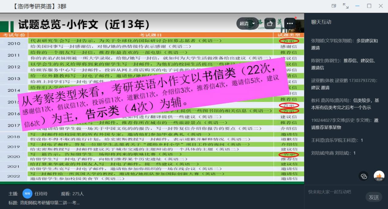 此次系列讲座由公外部王芳、任玲玲、陈萌、宁旭芳、韩艳丽、司马亚平六位教师主讲。系列讲座紧密围绕研究生英语考试大纲,结合近十年真题考点,帮助学生们梳理考研英语复习的重难点、做题方法和思路,引导学生科学高效地备考。讲座时间安排如下:7月15日上午由王芳老师主讲“考研英语导学+阅读新题型梳理”,7月18日上午由任玲玲老师主讲“考研英语写作”,7月29日上午由陈萌、宁旭芳老师共同主讲“考研翻译解析与完形填空”,8月2日上午由韩艳丽、司马亚平老师共同主讲“考研英语阅读理解”。各位老师大量查阅相关资料,精心准备讲座课件,通过解读考试大纲,分析历年真题考题特点,为学生们提供科学的备考建议和复习方法。此外,各位主讲老师还为学生们筛选了优质备考资源,上传至钉钉群供学生们下载查看。