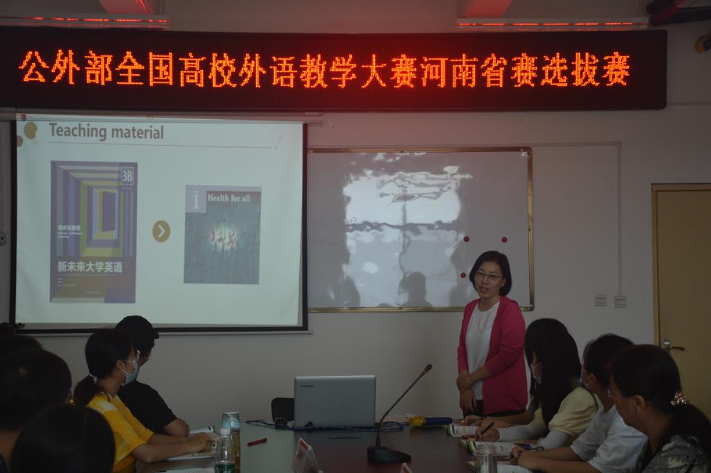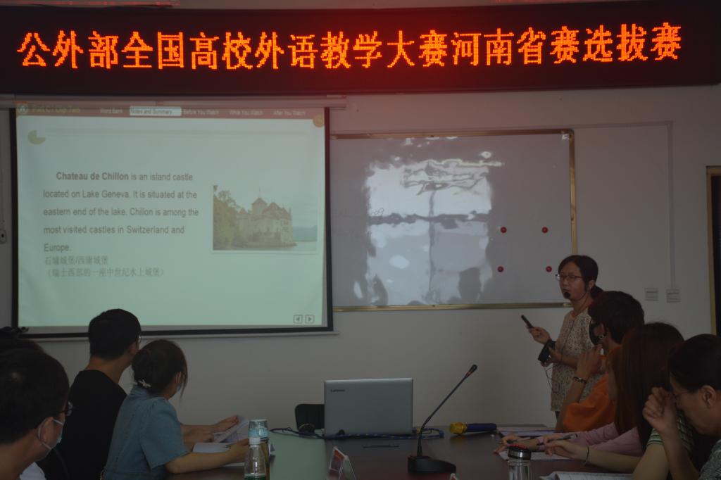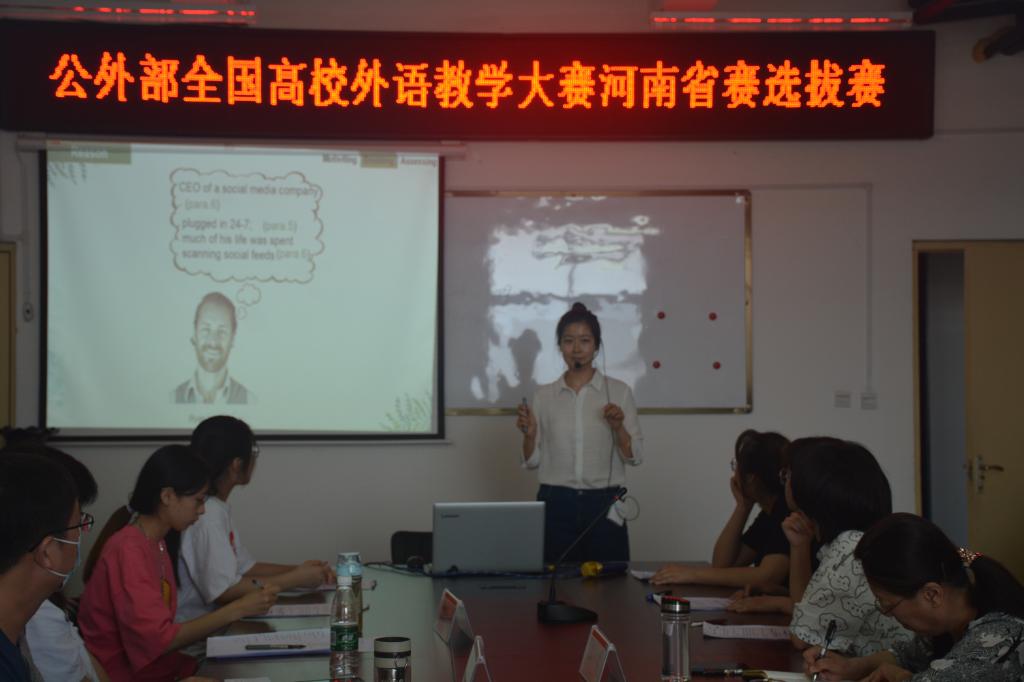 5月20日下午,公外部在敦行楼411会议室举行了全国高校外语教学大赛河南省赛选拔赛。本次比赛邀请教师发展中心孟宪乐教授、外国语学院商艳芝教授、公外部王莹主任以及陈占岐老师、陈杰老师、张小芳老师、赵乐芳老师担任评委,公外部全体教师参加了本次教学观摩活动。