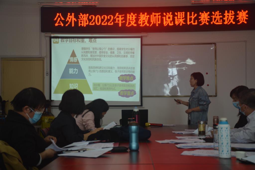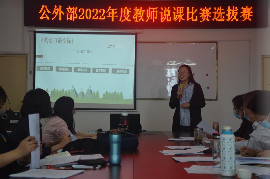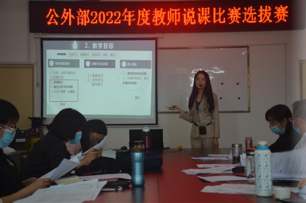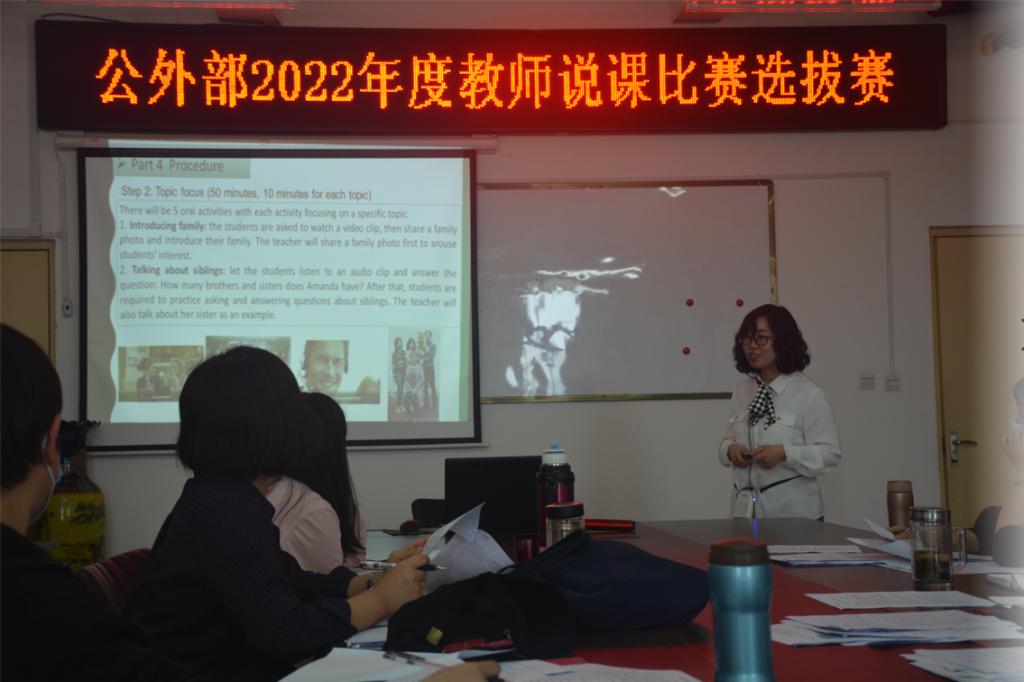 4月21日下午,公外部在敦行楼411会议室举行了2022年度教师说课比赛选拔赛暨首届洛阳师范学院说课大赛初赛。校督导组组长李建功老师,公外部王莹主任、张艳红副主任及全体教师参加了本次教学观摩活动。比赛邀请李建功、王莹、郎红琴、徐翠萍、王芳、岳俊琳、张丽丽担任比赛评委。