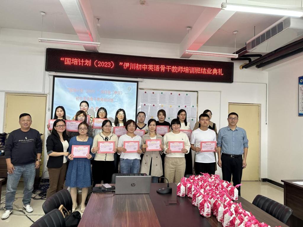2023年9月30日下午,“国培计划(2023)”项目县(伊川)初中英语骨干教师培训班结业典礼在敦行楼411会议室举行。本次结业仪式由公外部副主任张丽丽主持,继续教育学院谢聚峰主任、伊川县教育局教研员李学生等领导出席结业典礼并讲话,来自洛阳市伊川县的50名初中英语骨干教师参加了结业典礼。