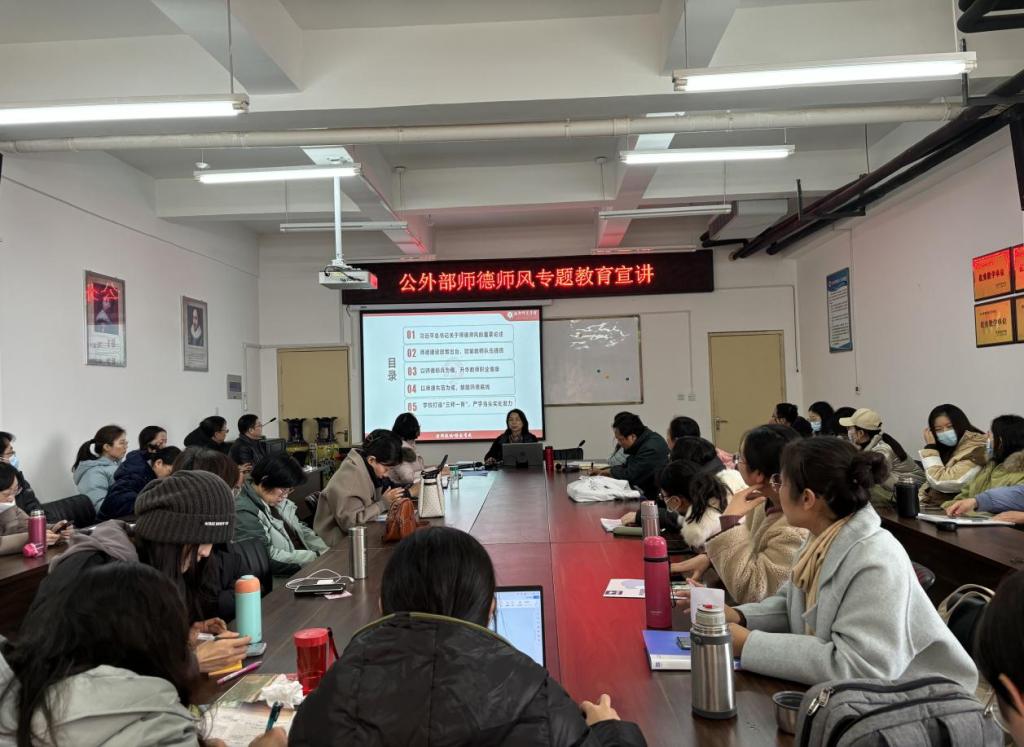 为深入学习贯彻习近平总书记关于教师队伍和师德师风建设的重要论述,进一步加强师德师风建设工作,12月28日下午,公外部召开以“严字当头实处发力,全面加强师德师风建设”为主题的师德师风专题教育宣讲会。公外部主任张艳红作师德师风教育专题讲座,部门全体教职工参会。