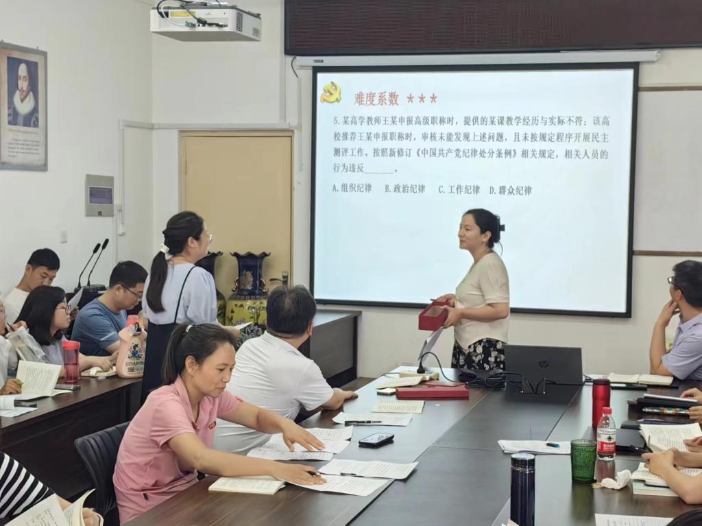 大会现场,教师们围坐一堂,气氛庄重而热烈。每位教师党员都准备充分,跃跃欲试。一个个鲜活的违纪案例融入选择、简答、辨析等题目,这些案例大多来源于教育系统内部,涵盖了违反政治纪律、组织纪律、廉洁纪律等多个方面。党员们通过抽签的方式依次上台作答。回答问题的过程中,不仅需要准确判断案例中的违纪行为,还需要深入分析违纪行为的根源、危害和教训。他们结合自身的工作实际和党性修养,给出了详细而深刻的解释。会上评出优秀答题党员15名。