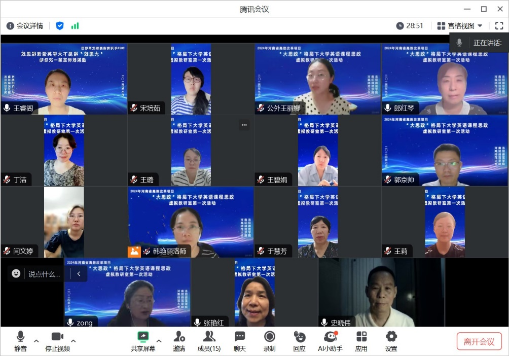 7月17日,河南省高等教育教学改革研究与实践项目“‘大思政’格局下大学英语课程思政教学团队建设研究与实践”课题组在线上召开首次虚拟教研室活动。河南师范大学史晓伟教授、南阳师范学院公外部主任宗云教授、洛阳师范学院公外部主任张艳红教授以及马克思主义学院于慧芳教授等应邀出席了本次活动。本次教研活动由项目负责人郎红琴教授主持,课题组全体成员参会。