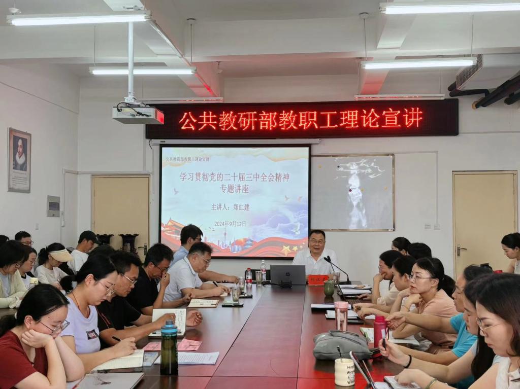 为深入学习贯彻党的二十届三中全会精神,增强教职工政治素养和理论水平,9月12日下午,公共教研部邀请校宣讲团成员郑红建在敦行楼411会议室为全体教职工开展“学习贯彻党的二十届三中全会精神”专题讲座,讲座由公共教研部党委书记李广主持。