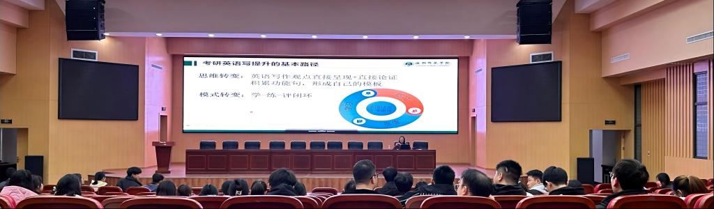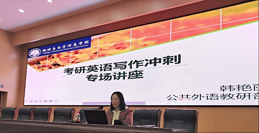 近日,在紧张的考研复习阶段,应物理与电子信息学院和历史文化学院的邀请,公外部韩艳丽和张方丽老师分别为两个学院的考研学生举行了考研英语写作冲刺讲座,旨在帮助同学们深入理解考研英语写作部分大纲要求和命题特征,并提供针对性的写作策略和功能句使用技巧助力写作提升。