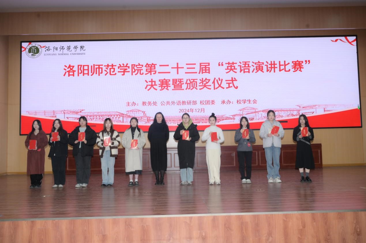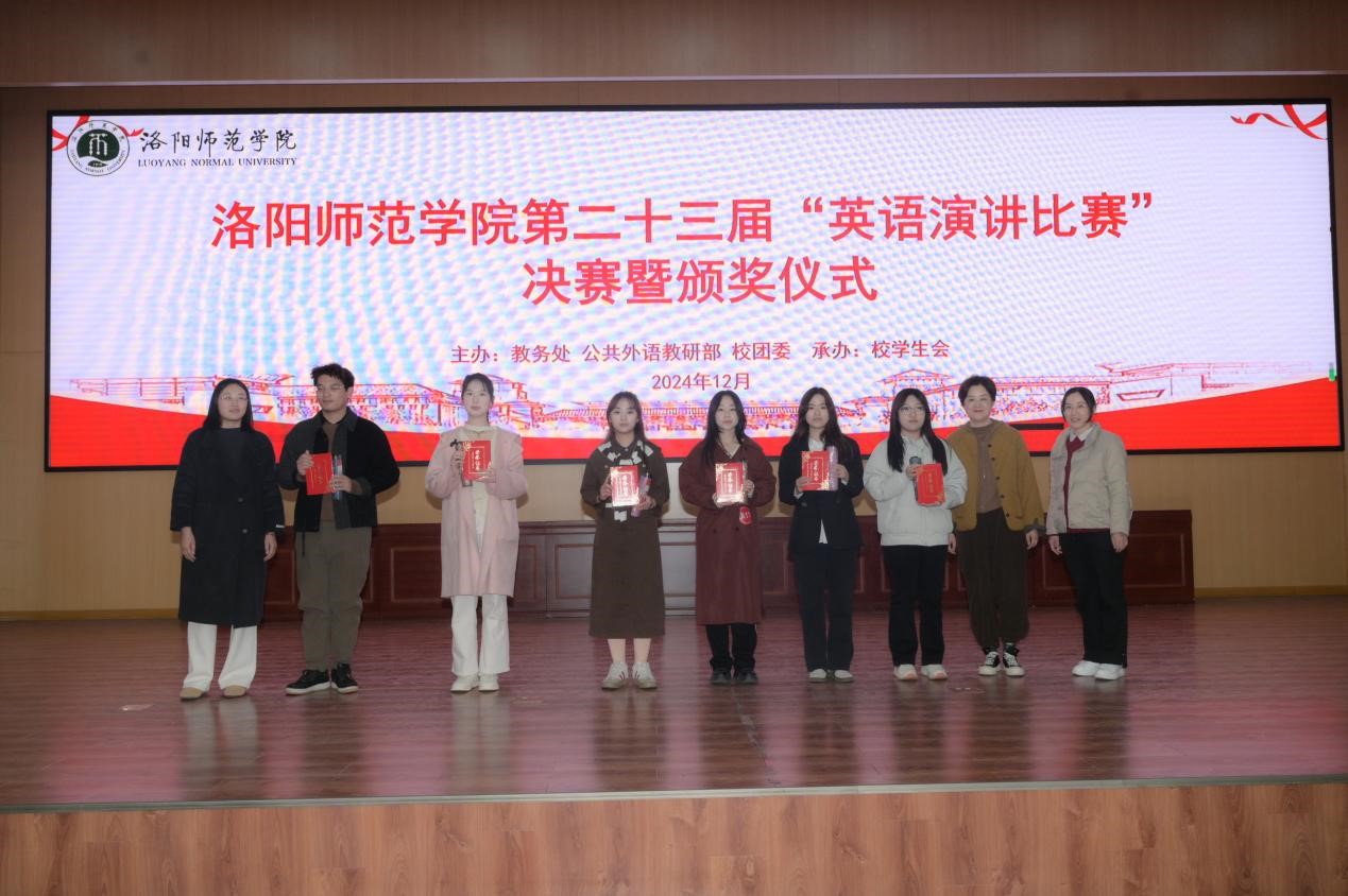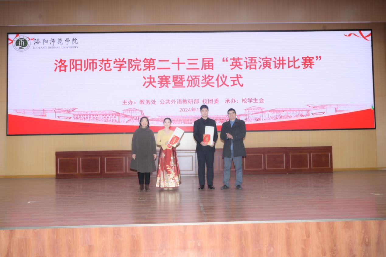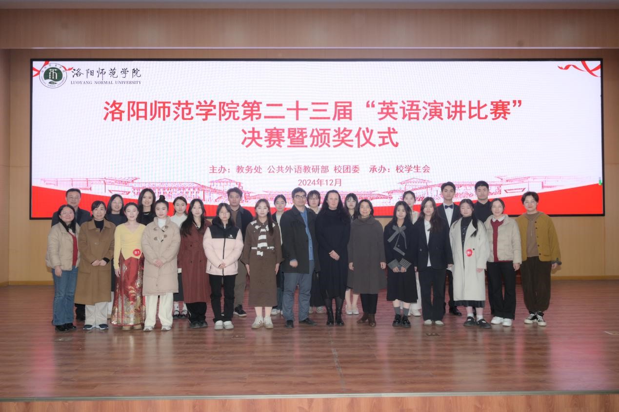 12月5日,由教务处、公共外语教研部、校团委主办,校学生会承办的我校第二十三届英语演讲比赛决赛在逸夫教学楼1号楼112报告厅隆重举行。出席本届演讲比赛的嘉宾有学生处处长郎晓林、团委书记高莹、招就处处长刁鸿安、教务处副处长裴航。担任此次比赛评委的有公共外语教研部主任张艳红、副主任张丽丽、郎红琴教授、张方丽副教授、王丽娜、韩艳丽老师以及外籍教师Janina。比赛由公共外语教研部教师黄保超和李卓凡共同主持。