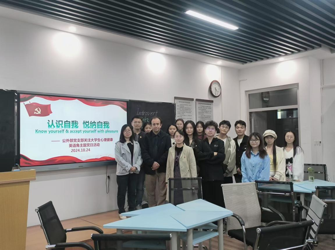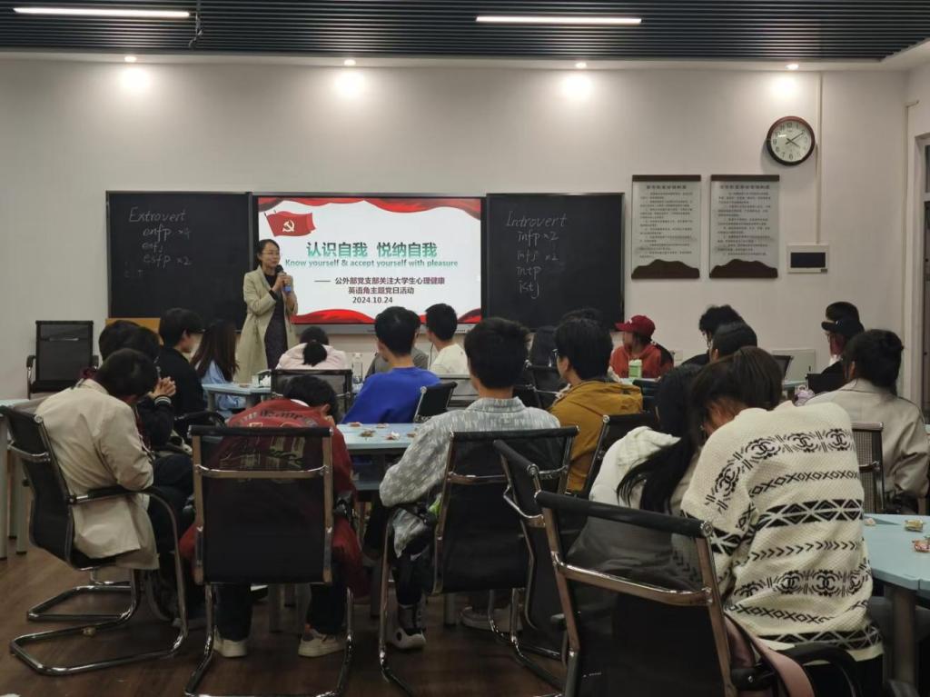 2024年10月24日下午,公外部党支部书记王璐和部分党员老师深入学生群体,在公共教学楼G3-107依托乐学社英语角活动开展了以“认识自我、悦纳自我,关注大学生心理健康”的主题党日活动。