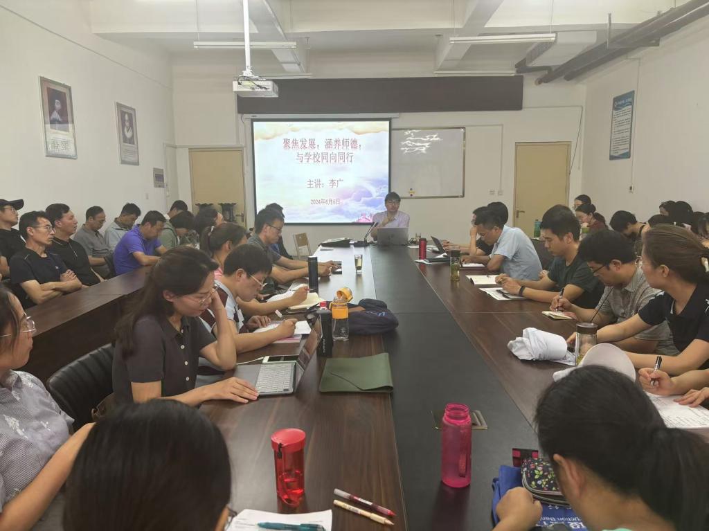 李广书记以“聚焦发展,涵养师德,与学校同向同行”为主题,通过系统梳理教育家精神在国内的发展脉络、师德师风建设历程,以及习近平总书记对教师职业的定位与期许,全面阐释了教育家精神的深刻内涵,强调了师德师风对教师及教育工作的重要意义。他指出,面对纷繁复杂的国际环境要提高警惕,保持职业操守;面对国家发展需求要积极作为,勇于担当使命;面对个人成长需求要精心规划,提升综合素质。最为关键的是要紧密围绕学校的发展大局,通过立足当下树形象,着眼未来立标杆,严守纪律保底线来真正涵养师德,落实好立德树人的根本任务。