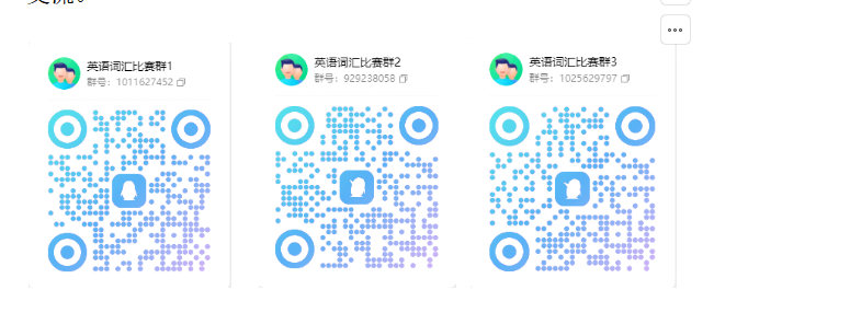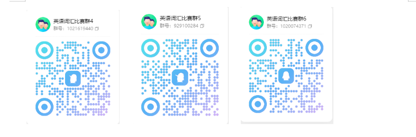 报名信息可在“学生端”——“词汇竞赛”内修改,报名截止后报名信息将不可修改。报完名的同学可以用QQ扫描下方二维码,加入其中一个群,入群有参赛辅导和交流。