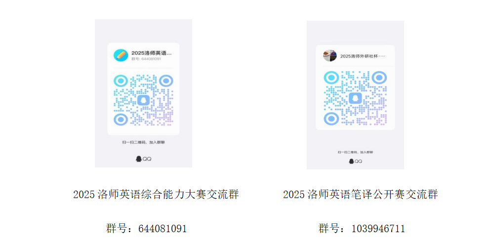 报名成功后,请务必加入赛事交流QQ群(2025洛师英语综合能力大赛交流群——群号:644081091;2025洛师英语笔译公开赛交流群——群号1039946711),并密切关注QQ群消息,了解赛前赛事安排(考场信息、考试安排等)及后续相关事宜(纸质证书领取等)。