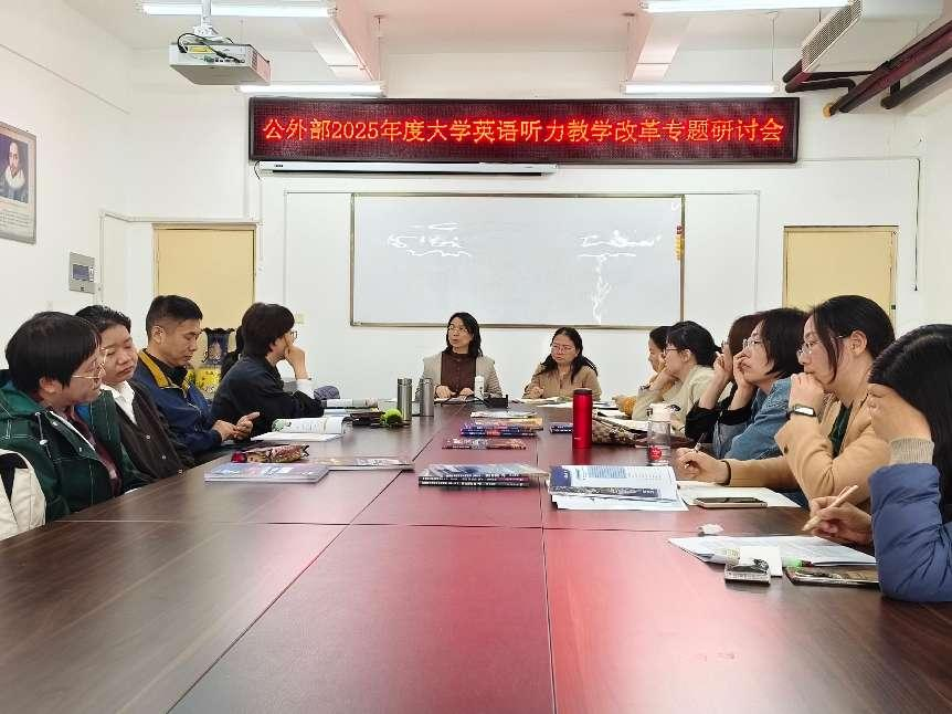 为进一步优化我校的大学英语听力教学模式,提升学生英语听力能力,公外部于4月3日下午在敦行楼411会议室召开大学英语听力教学改革专题研讨会。会议由张艳红主任主持,副主任张丽丽、各教研室正副主任及骨干教师参加会议。