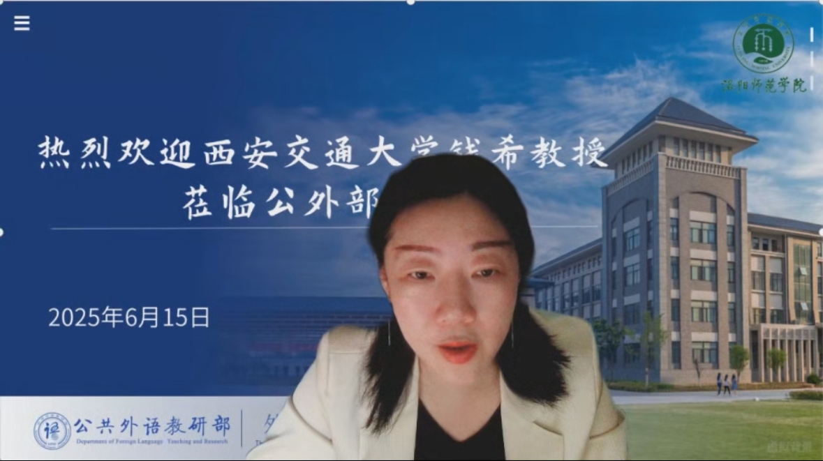 6月15日晚上,公共外语教研部特邀西安交通大学外国语学院钱希教授为即将参加河南省教学比赛的王碧娟、周湉两位教师进行赛前指导。本次指导交流会通过腾讯会议进行,30多位部门青年骨干教师全程参与观摩学习。