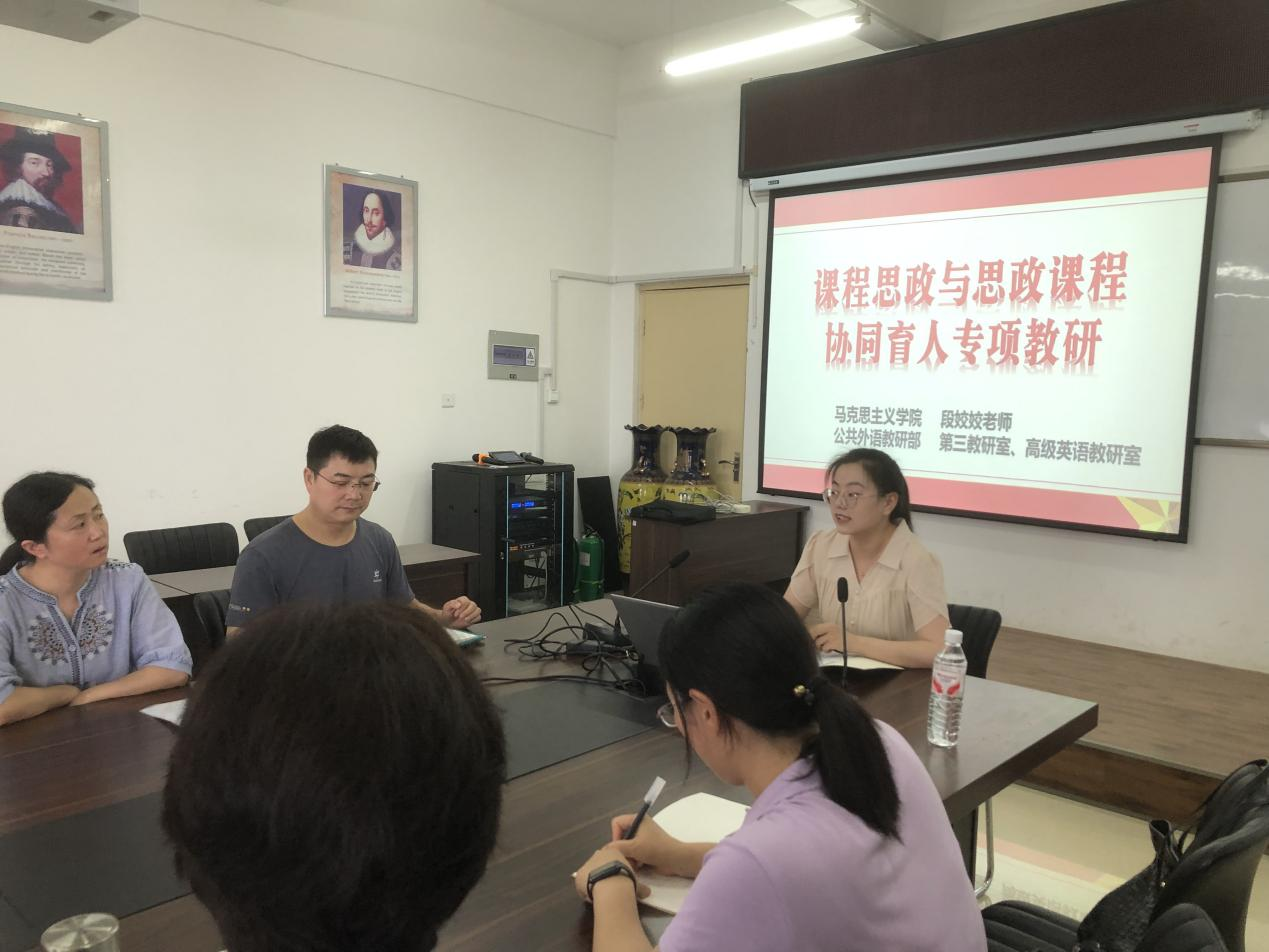 最后,部门的重点教研项目《“大思政”格局下大学英语课程思政教学团队建设研究与实践》课题组成员围绕如何提升课程思政的教学实效性与段老师进行了沟通交流。