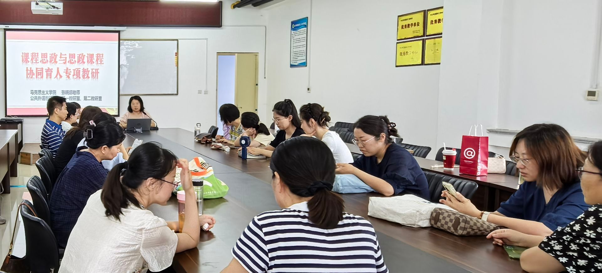 为深化课程思政建设,推动大学英语教学与思政教育深度融合,2025年6月19日,公共外语教研部邀请马克思主义学院张晓娜老师,与第一、二教研室教师在敦行楼411开展面对面研讨,共同探索协同育人新路径。
