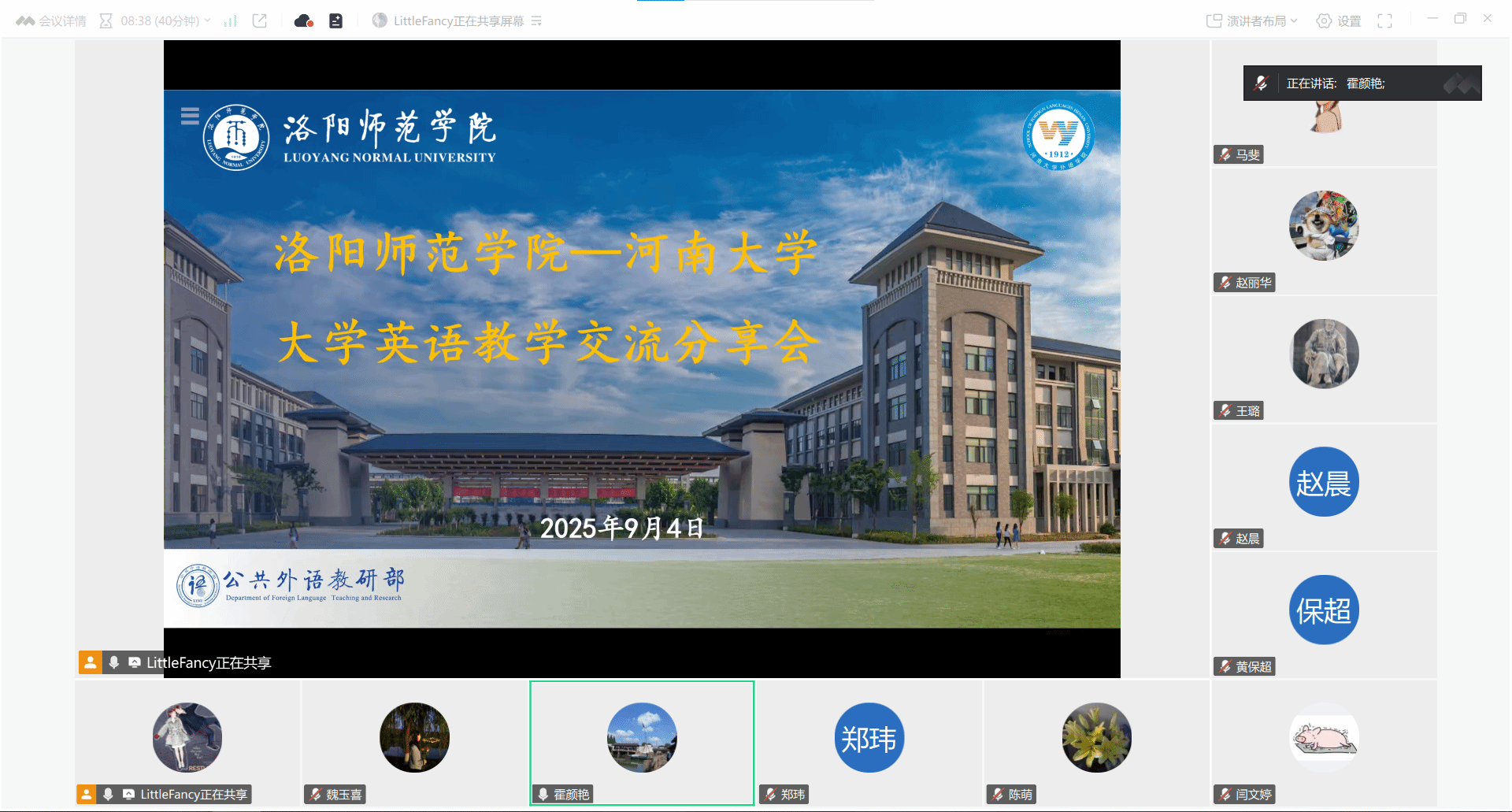9月4日晚,公共外语教研部(以下简称“公外部”)与河南大学大学外语教研部(以下简称“河大大外部”)通过腾讯会议平台成功举办线上教学交流活动。本次会议由公外部第一教研室主任王芳老师主持,两部门相关课程教师共同参与。