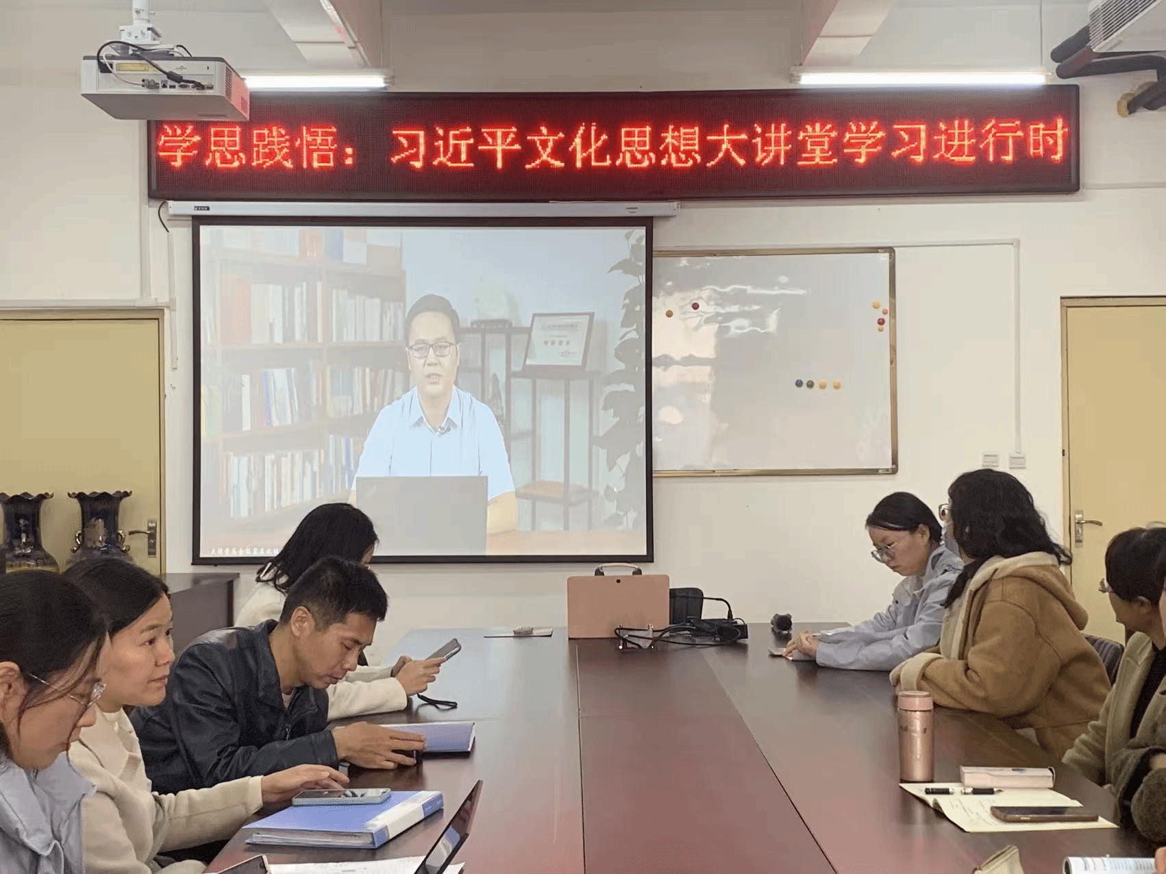 为深入学习贯彻习近平文化思想,切实把理论学习成果转化为教育教学实效,11月13日下午,公共外语教研部组织全体教师在敦行楼411集中观看学习习近平文化思想大讲堂第三讲,共同领悟“七个着力”重大要求的丰富内涵与实践伟力。