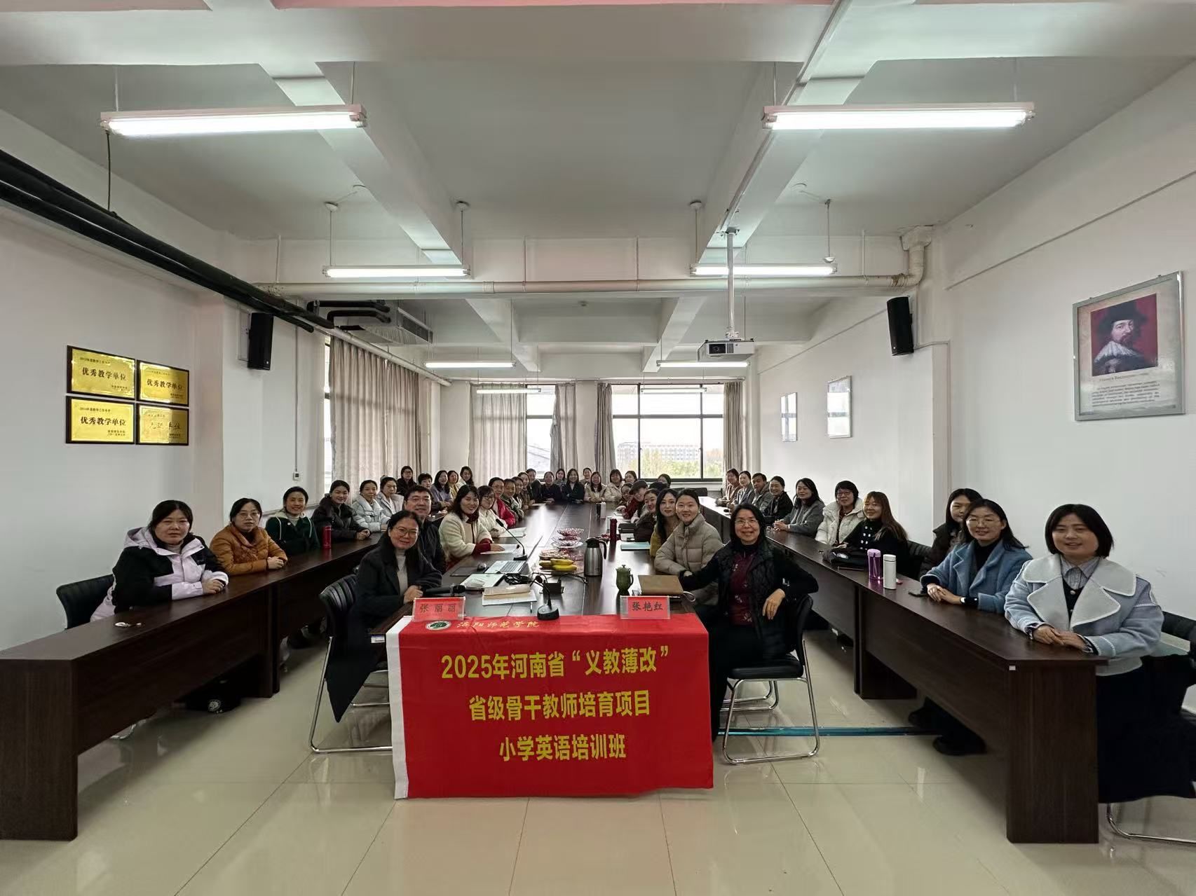 2025年11月24日上午,“义务教育师资薄弱环节改善暨中小学教师素质提升工程”省级骨干教师培育项目(小学英语)结业典礼在敦行楼 411会议室举行。公共外语教研部副主任张丽丽主持典礼,主任张艳红出席并讲话,班主任陈占岐、王邓峰、马斯敏及全体参训学员参加。