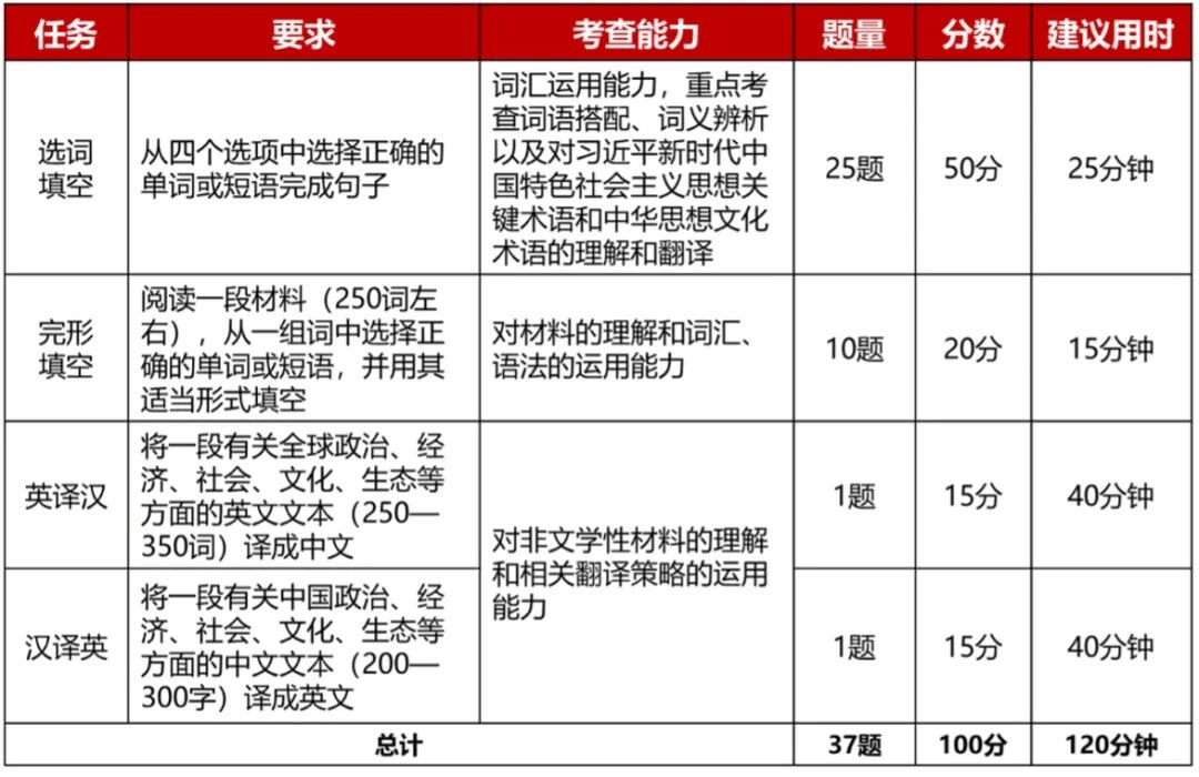本次综合能力赛项和笔译赛项题目类型、考查能力和分值如下图所示(综合能力见图一,笔译见图二),同学们可以有针对性复习,提前做好准备。