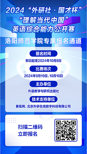 本届大赛依托“外研社·国才杯”“理解当代中国”英语综合能力公开赛2024年度我校专属平台报名。请同学们识别下方我校专属报名二维码,填写报名信息,缴费成功后,请务必加入赛事交流QQ群(洛师英语综合能力大赛交流群——群号:913263766),并密切关注QQ群消息,了解赛前赛事安排(如,考场信息、考试安排等)及后续相关事宜(纸质证书领取等)。