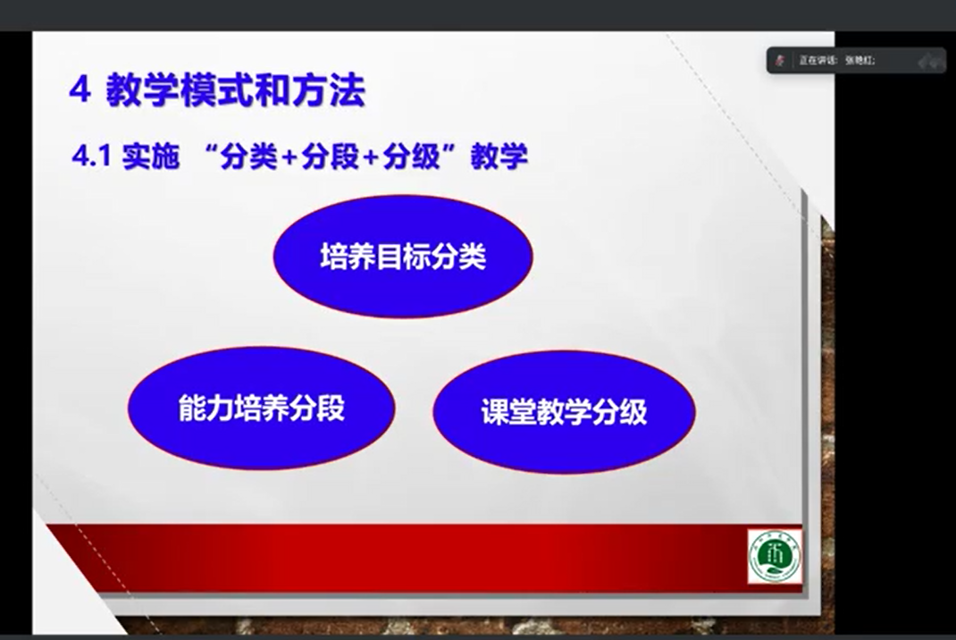 在报告中,张主任从课程定位与性质、教学目标和要求、课程设置、教学模式和方法及教学评估和考核五个维度,深度分享了洛阳师范学院大学英语教学改革的整体情况。随后,她重点介绍了我校的“分类+分段+分级”教学创新模式,该模式是以服务于我校的办学目标、院系的人才培养目标和学生的个性化发展需求,而展开的培养目标分类、能力培养分段和课堂教学分级教学。之后,张主任提出大学英语教学改革与实践方面的两点启示:一是以赛促学,通过实践教学促成长;二是以赛促教,通过教师教学比赛强队伍。最后,张主任回顾了目前部门开展的国家级及省级学生比赛成就及具体举措。