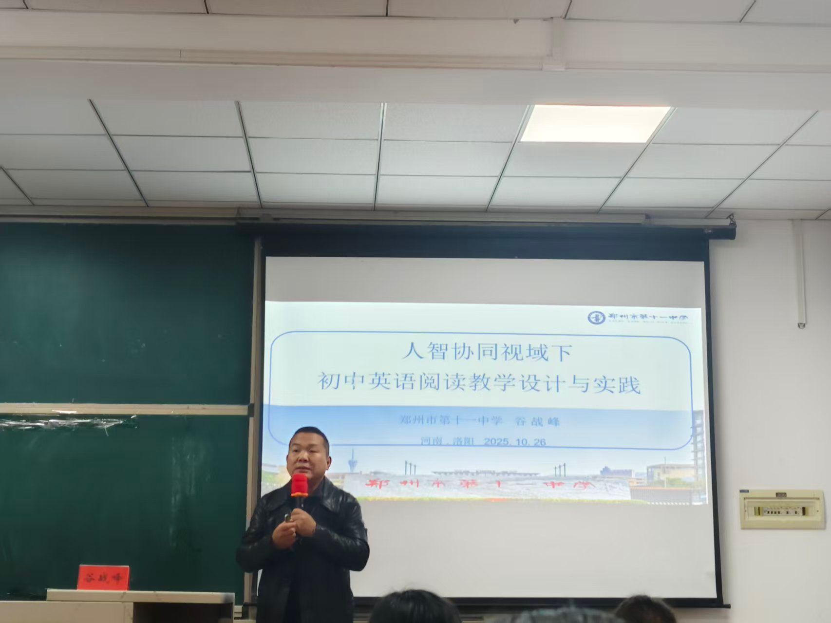 开班典礼结束后,初中英语专项培训随即在继续教育学院A6-318会议室拉开帷幕。首场专题报告特邀郑州十一中省外语一级学科基地负责人谷战峰老师,以“人智协同视域下初中英语阅读教学设计与实践”为题,为学员们带来了一场理念前沿、案例丰富的学术盛宴,现场互动热烈,思维激荡。