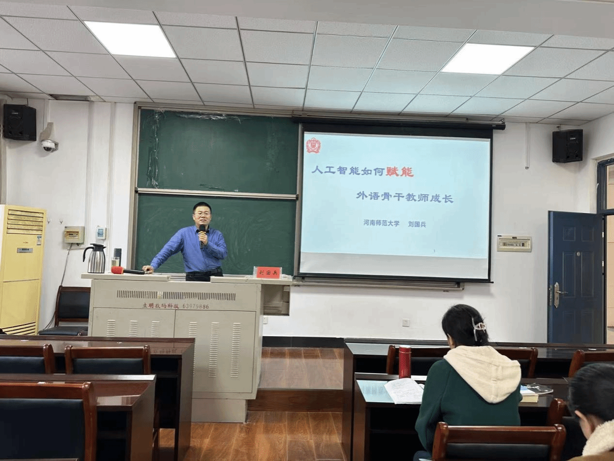 11月21日下午,应公共外语教研部与外语教育与测评研究中心的邀请,河南师范大学外国语学院院长刘国兵教授围绕“人工智能赋能外语教师成长”主题,为省级骨干教师小学英语培训班学员及公外部教师带来了一场专题讲座。
