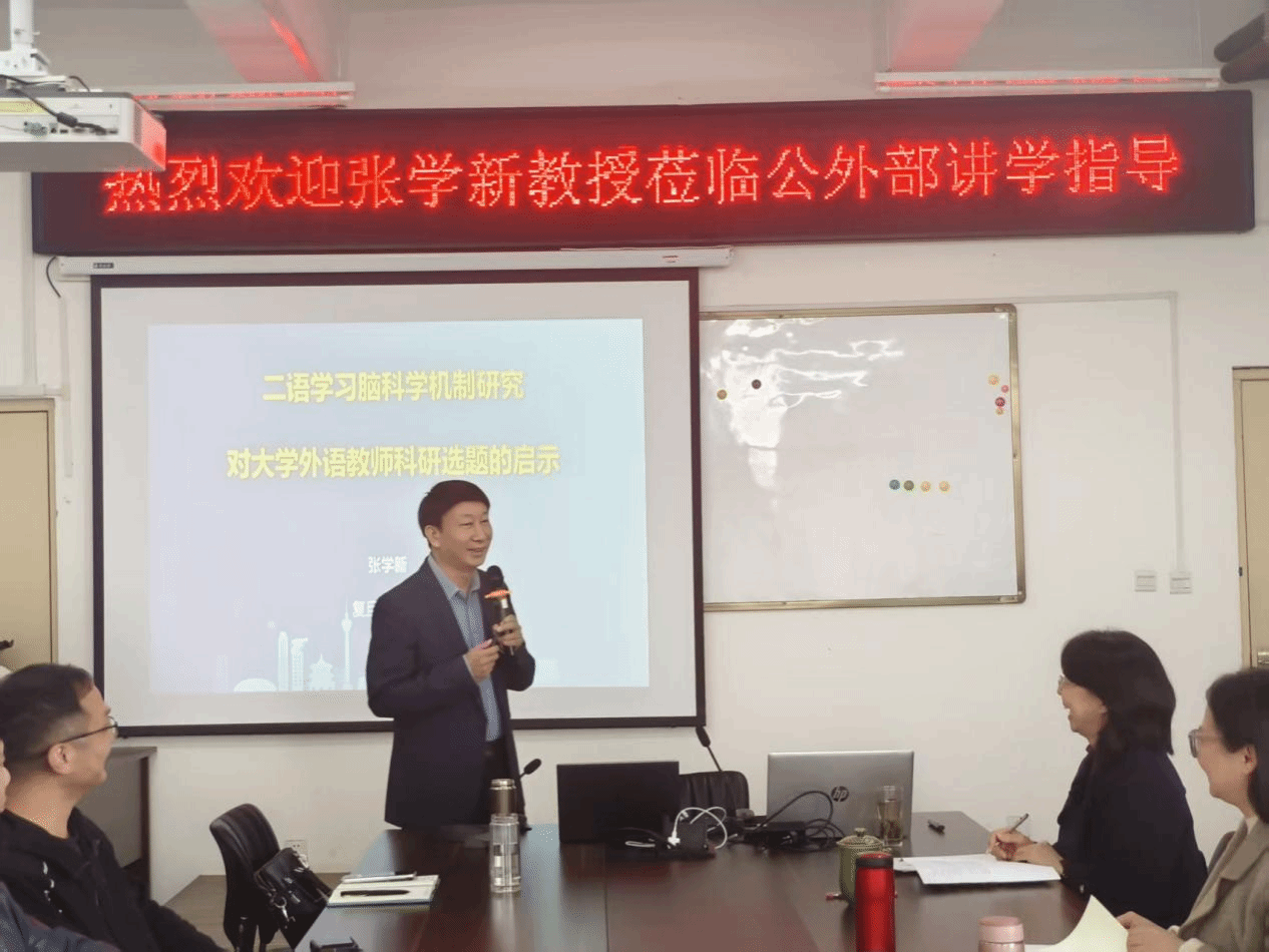 2025年10月30日下午,复旦大学张学新教授应邀为公共外语教研部全体教师带来一场题为“二语学习脑科学机制研究对大学外语教师科研选题的启示”的专题讲座讲座由张艳红主任主持。