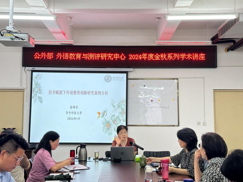 2024年9月19日下午,华中科技大学徐锦芬教授应邀为部门教师作了题为“技术赋能下外语教育创新研究案例分享”的精彩讲座。本次讲座由公外部主任张艳红教授主持,部门全体教师参加。