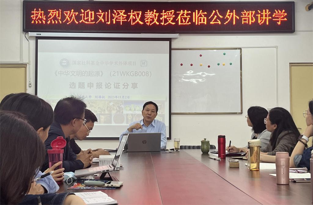 11月2日下午,应公共外语教研部、外语教育与测评研究中心邀请,河南大学刘泽权教授莅临公共外语教研部开展了“国家社科基金中华学术外译项目选题申报论证分享会”。