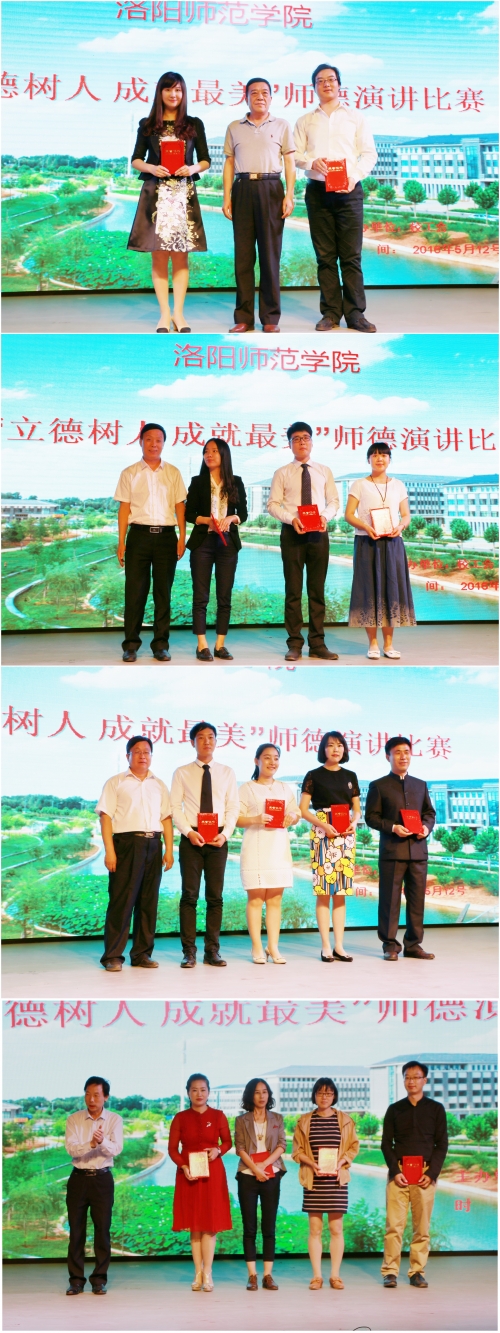 经过激烈地比拼,最终新闻与传播学院刘淏、音乐学院王珠峰斩获一等奖;学前教育学院赵静、文学院张曼,物理与电子信息学院张亚刚,数学科学学院王众杰获得二等奖;艺术设计学院申冰、生命科学学院郭燕杰、信息技术学院娄颖颖、公共教研部马斐获得三等奖,同时评选出了4名优秀奖。本次比赛的优秀选手将推荐参加河南省教科文卫体工会举办的全省“师德”演讲比赛。
