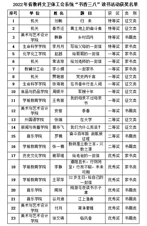 近日,河南省教科文卫体工会通报2022年“书香三八”读书活动获奖情况,我校23篇作品获奖,其中特等奖4篇,一等奖8篇,二等奖4篇,优秀奖7篇,获奖等级和数量均名列全省高校前茅。