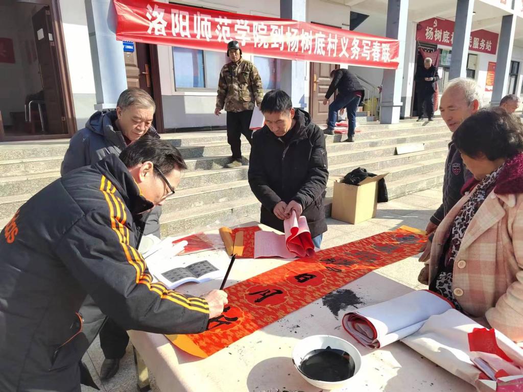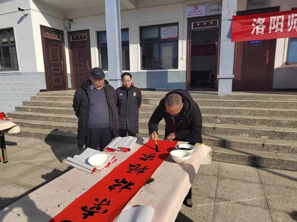 1月26日,迎着冬日里久违的暖阳,校党委副书记、工会主席李晓彦、副校长张运礼带领党委组织部、工会办公室、图书馆、后勤处、美术与艺术设计学院等部门负责人和书法家,来到栾川县庙子镇杨树底村义写春联,弘扬中华民族传统优秀文化,营造幸福、祥和节日氛围,把浓浓的年味和美好的祝福送给村民们,以实际行动助力乡村振兴建设。