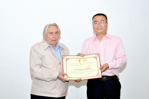 校长梁留科对西多罗夫教授一行的到来表示热烈欢迎,并就学校概况、学校发展目标及规划进行了简要介绍。梁校长表示,学校积极实施开放办学战略,全力推动国际办学合作化趋势,与意大利都灵理工大学等开展了多种形式的国际合作,前不久又与英国奥斯特大学等达成合作意向,西多罗夫教授所在学校在艺术设计方面有许多先进经验值得学习,期待今后能经常开展交流合作,并诚意祝福西多罗夫教授和他的夫人身体健康。随后,梁校长向西多罗夫教授颁发荣誉教授证书,并向西多罗夫教授赠送纪念品。