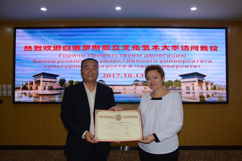 随后,两校签署《洛阳师范学院与白俄罗斯国立文化艺术大学合作备忘录》,梁留科校长向科布特·安丽娜·安娜道里夫纳女士授予“荣誉教授证书”。