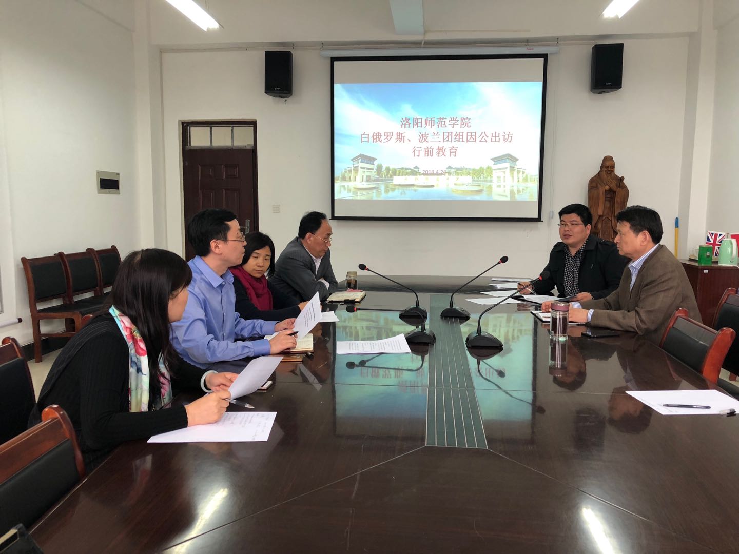 根据国家外事工作纪律和要求,结合学校实际,受学校党委的委托,近日国际合作交流处集中组织召开洛阳师范学院2018年因公临时出国(境)团组行前教育培训会。参加的团组有赴白俄罗斯和波兰自组团组、赴波兰教育教学交流团组、赴美国科研学术交流团组、赴法国和爱尔兰自组团等。此次培训会在国际合作交流处A1-430会议室召开,国际合作交流处负责人及外事工作相关负责人参加了会议。会议由国际合作交流处处长李哲鹏主持。