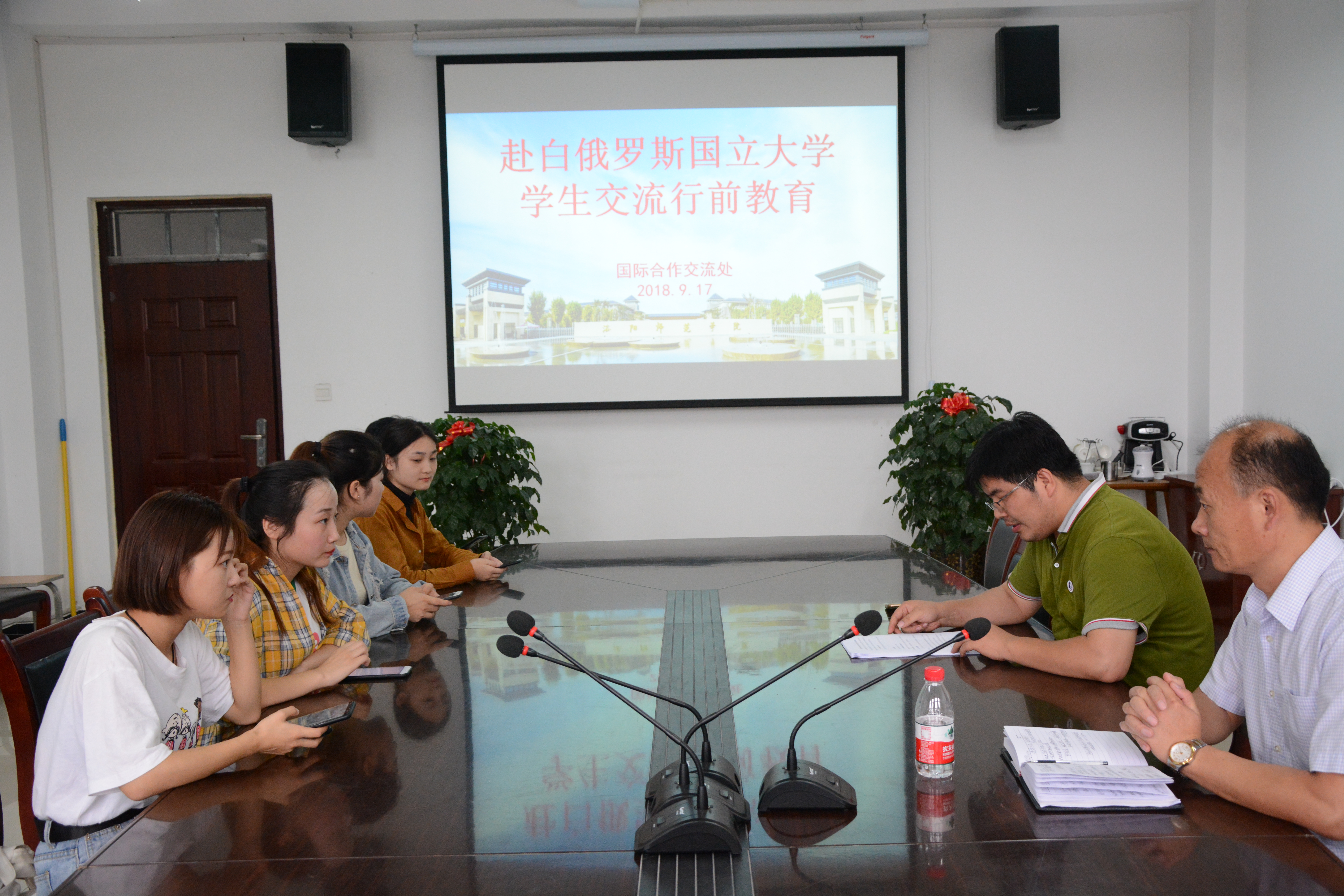 根据国家外事工作纪律和要求,结合学校实际,9月17日国际合作交流处集中组织召开洛阳师范学院2018年赴白俄罗斯国立大学学生交换组行前教育培训会。参加此次培训会的有赴白俄罗斯国立大学交换的学生、新闻传播学院负责人以及国际合作交流处相关工作人员,会议在国际合作交流处A1-430会议室召开,国际合作交流处外事工作负责人主持会议。