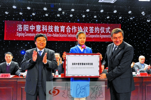 编者按:《大河报》11月25日AL03版,以《洛师“牵手”都灵理工大学 对优秀学子进行联合培养》为题,图文报道洛阳中意科技教育合作协议签约仪式在我校新校区举行。院长时明德向原意大利都灵理工大学校长、原意大利教育部部长弗朗西斯科·普罗夫莫先生等人颁发洛阳师范学院荣誉教授证书等我校与意大利合作情况。原文及链接如下: