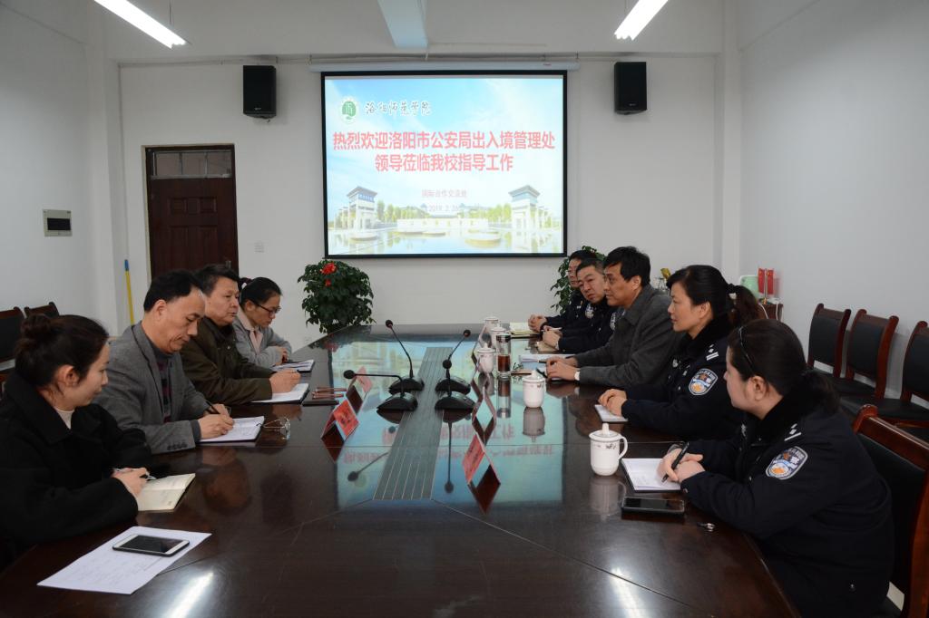宋志刚队长悉心听取了我校的外事工作汇报,对我校的外事交流工作所取得的成就给予了充分的肯定,并指出我校富有成效地开展外事交流工作不仅是学校办学国际化发展战略的要求,也是洛阳市教育、文化、旅游等产业发展的窗口。他指出洛阳师范学院积极开展中外合作办学、建设境外分校河洛学院、聘请外籍教师、培养来华留学生等工作,在很大程度上带动了洛阳作为副中心城市的对外合作交流工作,提升了洛阳乃至中原地区经济社会国际化发展水平,促进城市向绿色产业转型,极大提升了城市品质。随后,宋志刚处长从长期涉外工作经验出发,为我校境外人员管理工作提出了前瞻性建议,并表示在今后的工作中进一步做好警校联合、信息共享、责任到人、上下联动、确保稳定,切实解决境外人员的后顾之忧,充分发挥外国教师、专家学者的工作积极性和智能优势,进一步满足地方经济社会发展需求。