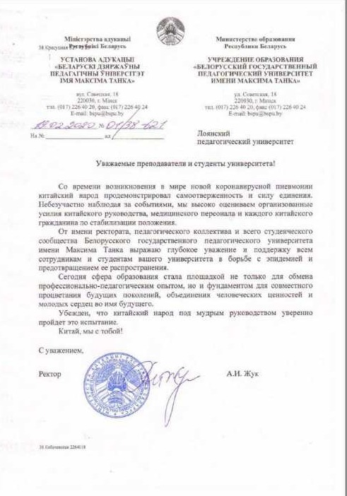 在疫情突发的情况下,白俄罗斯国立师范大学校长亚历山大 • 茹科教授代表全校师生发来慰问信。他高度关注我国国内疫情防控工作的发展,并对此时“中国人民团结一致,积极投入疫情防控工作中,向世界人民表现了万众一心、自我奋斗与自我牺牲的精神,以及对中国政府、医护人员和全体人民为战胜疫情所表现出的坚定勇气和自我牺牲精神表示钦佩。”他在来电中表示,白俄罗斯国立大学全体师生愿与我校师生团结一致,共同抵御疫情。