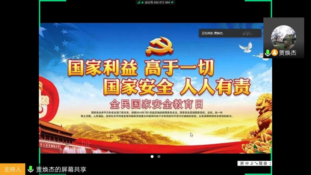 会上,贾焕杰首先对设立全民国家安全教育日的目的意义以及今年的活动主题“坚持总体国家安全观,统筹传统安全和非传统安全,为决胜全面建成小康社会提供坚强保障”进行了阐述,指出国家安全系于全体公民的点滴努力,每一个人都不可掉以轻心。