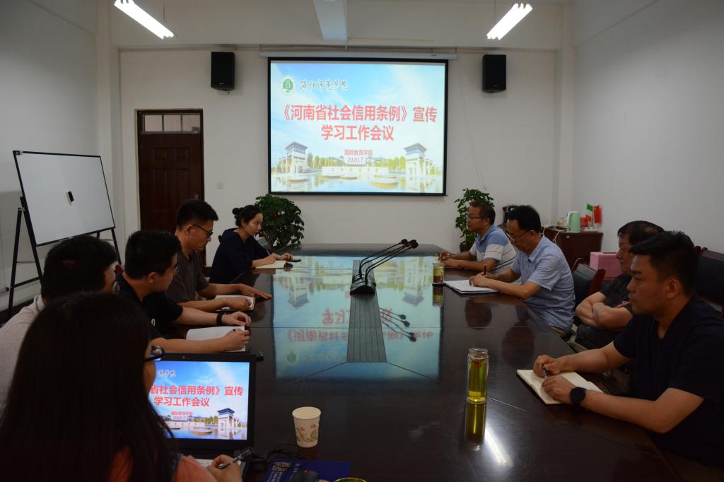 《河南省社会信用条例》于2020年5月1日起施行,为进一步加强《河南省社会信用条例》贯彻落实,深化条例宣传工作,营造学条例、用条例、守条例的浓厚氛围,提高我中心全体教职工的信用意识和依法行政能力,7月2日下午,国际合作交流中心、国际教育学院在会议室召开了《河南省社会信用条例》宣传工作会议,由国际合作交流中心副主任贾焕杰主持,全体教职工参加。