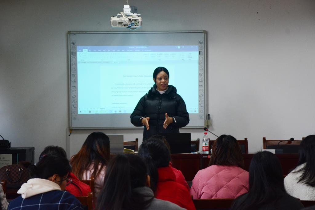 在学前教育学院专场,美国ESL教师Jessica Anne Orlando女士以“课程设计——美式课堂的应用与实践”为题授课,全面呈现美式课堂教学特点,对我校教师融合中西方教学优长产生启迪。在商学院、电子商务学院专场,河南省电子商务协会秘书长张苏丰先生以“创新产教融合协同育人机制,助力高水平学科专业建设”为题授课,立足新时代中国经济、教育特色,启示各位教师从更高维度、更广空间思考人才培养方式和学科建设方法。在教育科学学院教师专场,Ben Marotel先生和Tendai Catheline Minhawo女士以“小学教师教育的未来发展趋势”为题授课,帮助各位教师从小学教育所处地位、小学教师教育面临的机遇和困境等角度思考规划职业道路。在教育科学学院学生专场,郑州市文化路第三小学教育集团校长陈丽霞女士以“准备好做大先生”为题进行一线教师实用人才培养授课,详细讲解师德重要性和优秀教师标准,以班主任的一天为范例激励学生做“四有”好老师,并表示将提供实习岗位、招教面试指导和优选代课岗位助力学生职业发展。