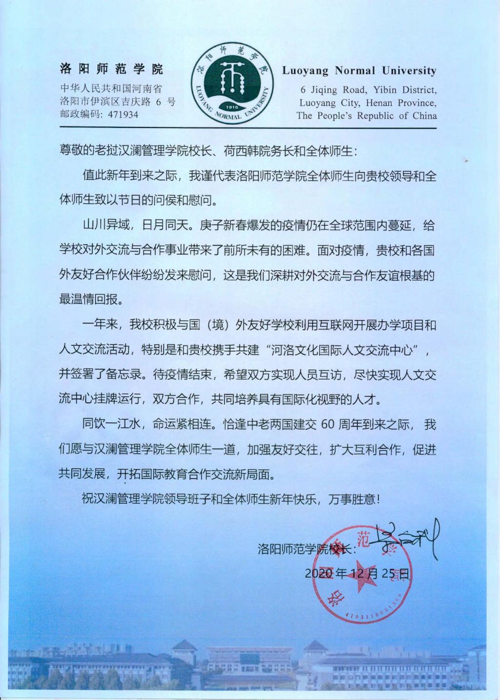 梁留科在回信中表示,新冠疫情给我校对外交流与合作事业带来前所未有的困难,贵校和各国外友好合作伙伴纷纷发来慰问,是对我们深耕对外交流与合作友谊根基的最温情回报。一年来,我校积极与国(境)外友好学校利用互联网开展办学项目和人文交流活动,特别是和贵校携手共建“河洛文化国际人文交流中心”并签署备忘录。疫情结束后希望实现双方人员互访,尽快挂牌运行人文交流中心,共同培养具有国际化视野的人才。恰逢中老两国建交60周年,我们愿与汉澜管理学院全体师生一道,加强友好交往,,扩大互利合作,促进共同发展,开拓国际教育合作交流新局面。