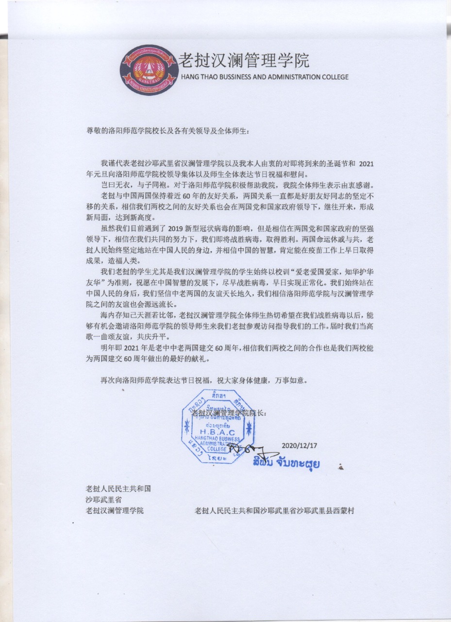 来信表示,老中两国一直都是坚定不移的好朋友好同志关系,相信两校之间的友好关系也会在两国党和政府领导下,继往开来,形成新局面、达到新高度。老挝人民始终坚定地站在中国人民身边,并相信中国智慧能在疫苗工作上早日取得成果,造福人类。老挝学生尤其是汉澜管理学院学生始终以校训“爱老爱国爱家,知华护华友华”为准则,坚信中老两国友谊天长地久,热切希望战胜病毒后能够邀请洛阳师范学院领导师生来老挝参观访问指导工作。2021年是老中中老两国建交60周年,届时当高歌一曲颂友谊,共庆升平。
