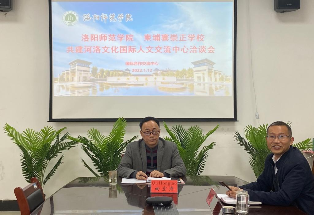 1月12日,应河南贸促会与柬埔寨国际商会共同牵线邀请,我校与柬埔寨崇正学校举办共建河洛文化国际人文交流中心洽谈会,会议在线召开。河南省贸促会国际部主任王友为,柬埔寨国际商会秘书长、洛阳师范学院国际合作交流中心河洛文化推广工作助理马虹,柬埔寨崇正学校教务处主任高文胜出席会议。国际合作交流中心相关领导与外事工作人员参加会议。会议由国际合作交流中心主任曲宏涛主持。