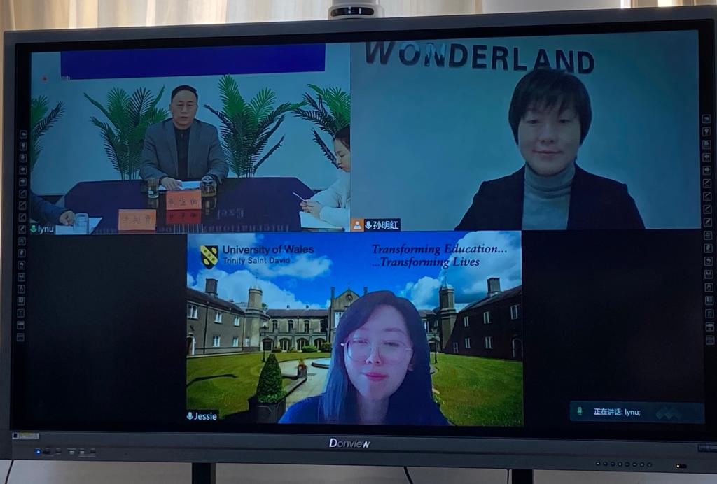 2月23日,英国威尔士三一圣大卫大学文化教育交流部主任Jessie以及环球雅思负责人应邀参加两校合作交流洽谈会。会议在线举行,由国际合作交流中心曲宏涛主任主持。